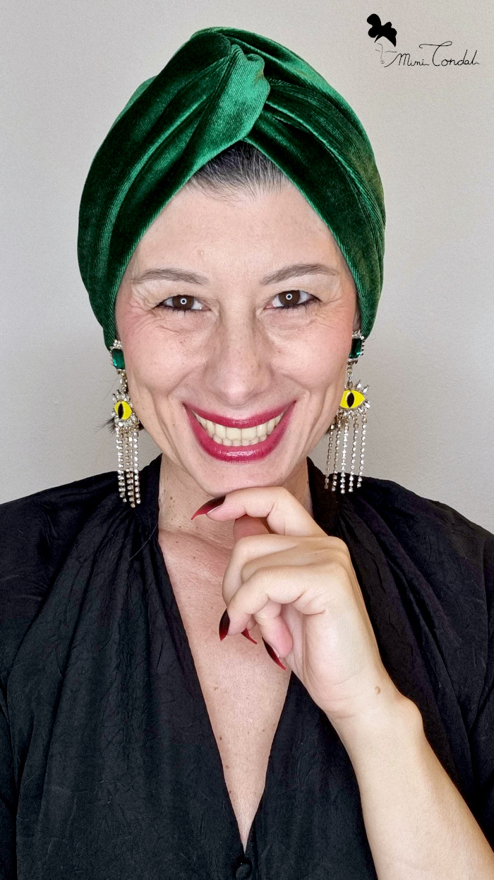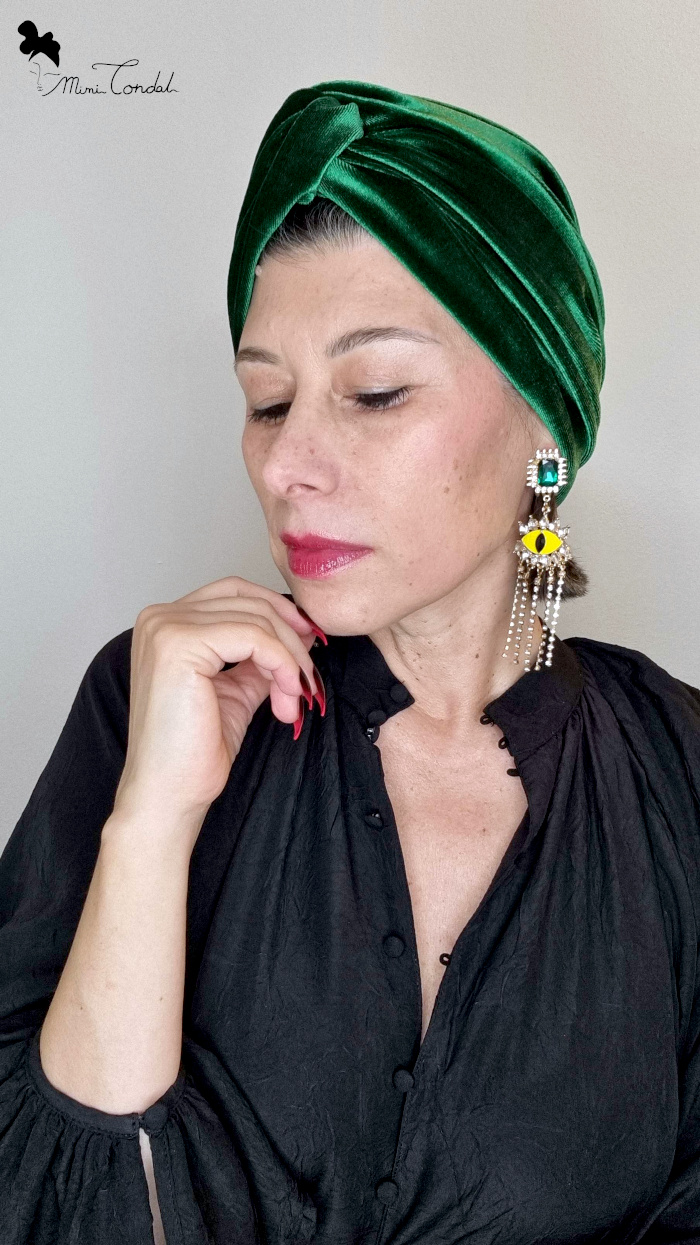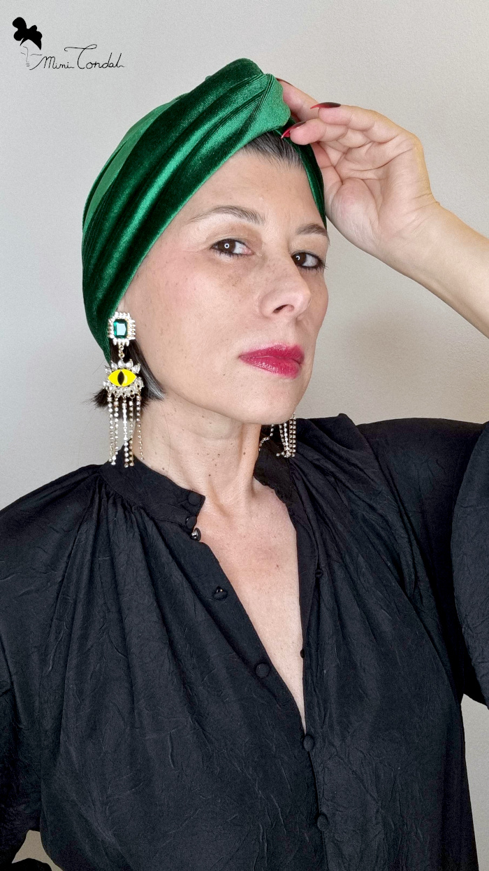 Questo turbante in velluto, caratterizzato da una tonalità verde smeraldo intensa e vibrante, rappresenta una scelta raffinata e funzionale da integrare in un guardaroba moderno.